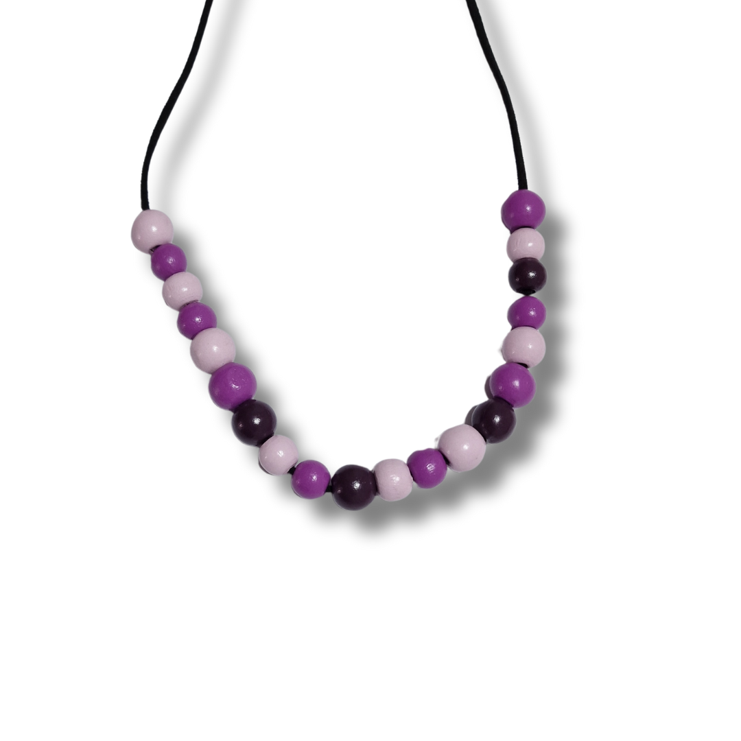 Colierul cu mărgele din lemn în nuanțe de mov și lila este un accesoriu handmade delicat, creat pentru a adăuga o notă de culoare și naturalețe oricărei ținute. Fiecare mărgea, cu diametrul de până la 2 cm, este vopsită manual, iar șnurul din piele, ajustabil (aprox. 40 cm), oferă confort și versatilitate la purtare.