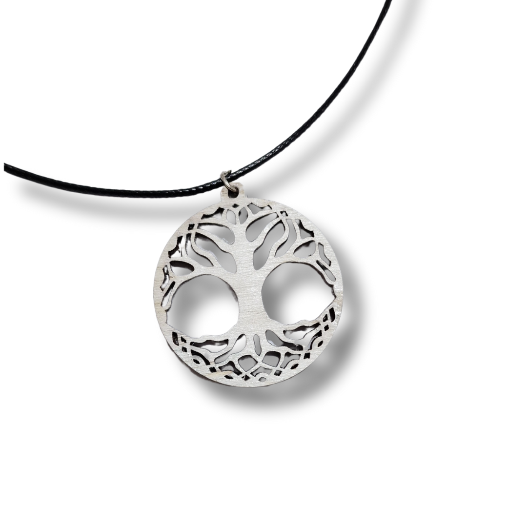 Colier cu medalion din lemn – Copacul Vieții este un accesoriu plin de simbolism și eleganță naturală. Medalionul din placaj de lemn, decupat cu finețe, reprezintă Copacul Vieții – simbol al echilibrului, al legăturii dintre pământ și cer și al puterii de a crește prin fiecare experiență.