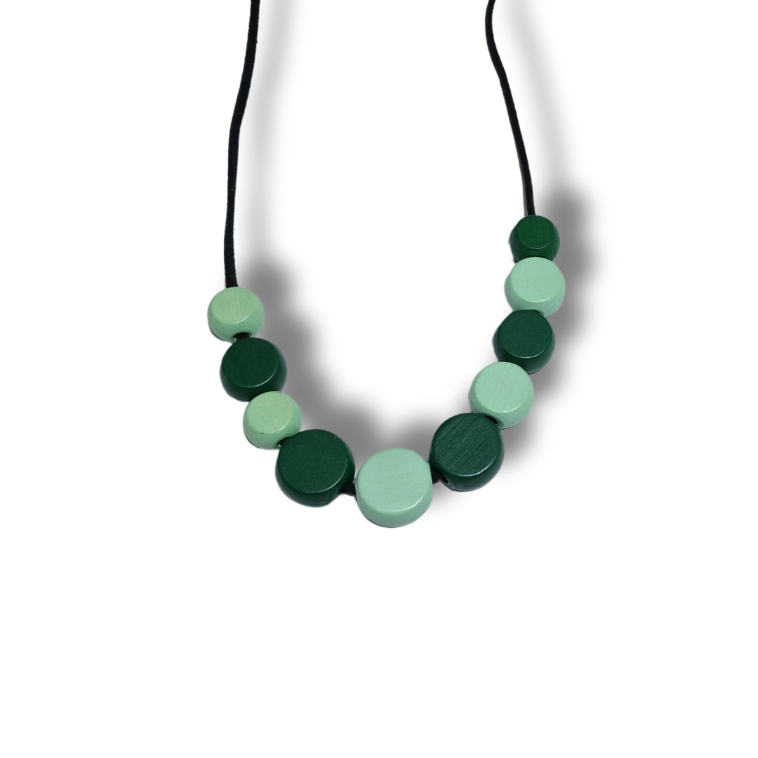 Colierul cu mărgele plate din lemn, în nuanțe de verde pastel și verde închis, este un accesoriu handmade modern și ușor de purtat. Fiecare mărgea rotundă, cu diametrul de până la 2 cm, este vopsită manual, iar contrastul subtil dintre nuanțe aduce un plus de eleganță naturală.