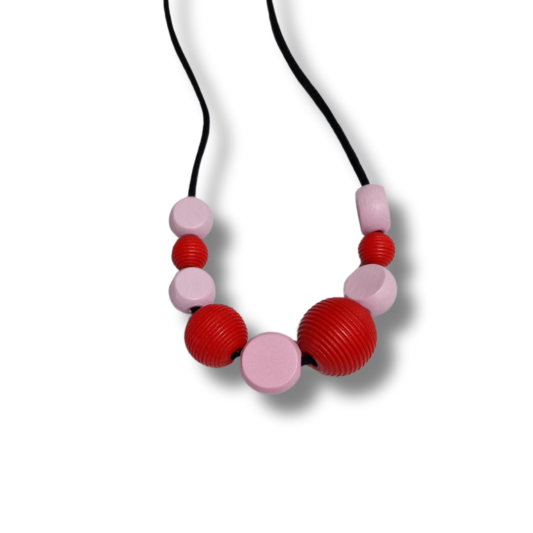 Colier handmade cu mărgele rotunde din lemn - roșu și roz pastel