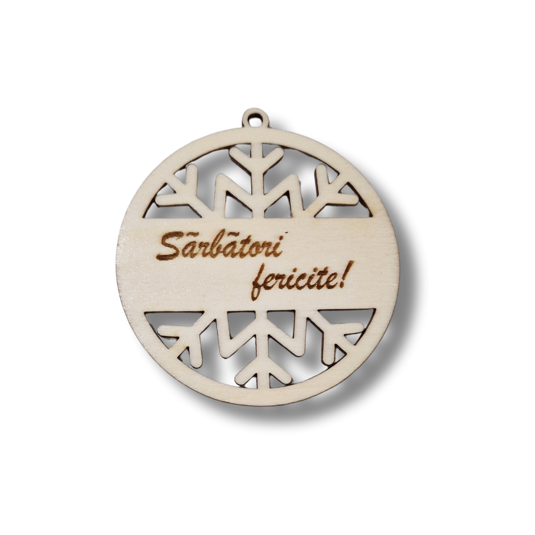 Glob de Crăciun în formă rotundă cu model cu fulg realizat din lemn gravat. Acesta este ideal pentru iubitorii de decorațiuni simple, minimaliste și prietenoase cu mediul înconjurător.