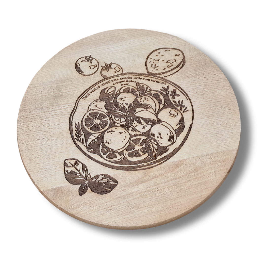 Un platou rotativ din lemn care aduce zâmbete la orice masă! Gravura detaliată cu ilustrație de aperitive și mesajul amuzant „Dacă vezi că citești asta, snacks-urile s-au terminat” transformă acest obiect într-o piesă decorativă și practică în același timp.