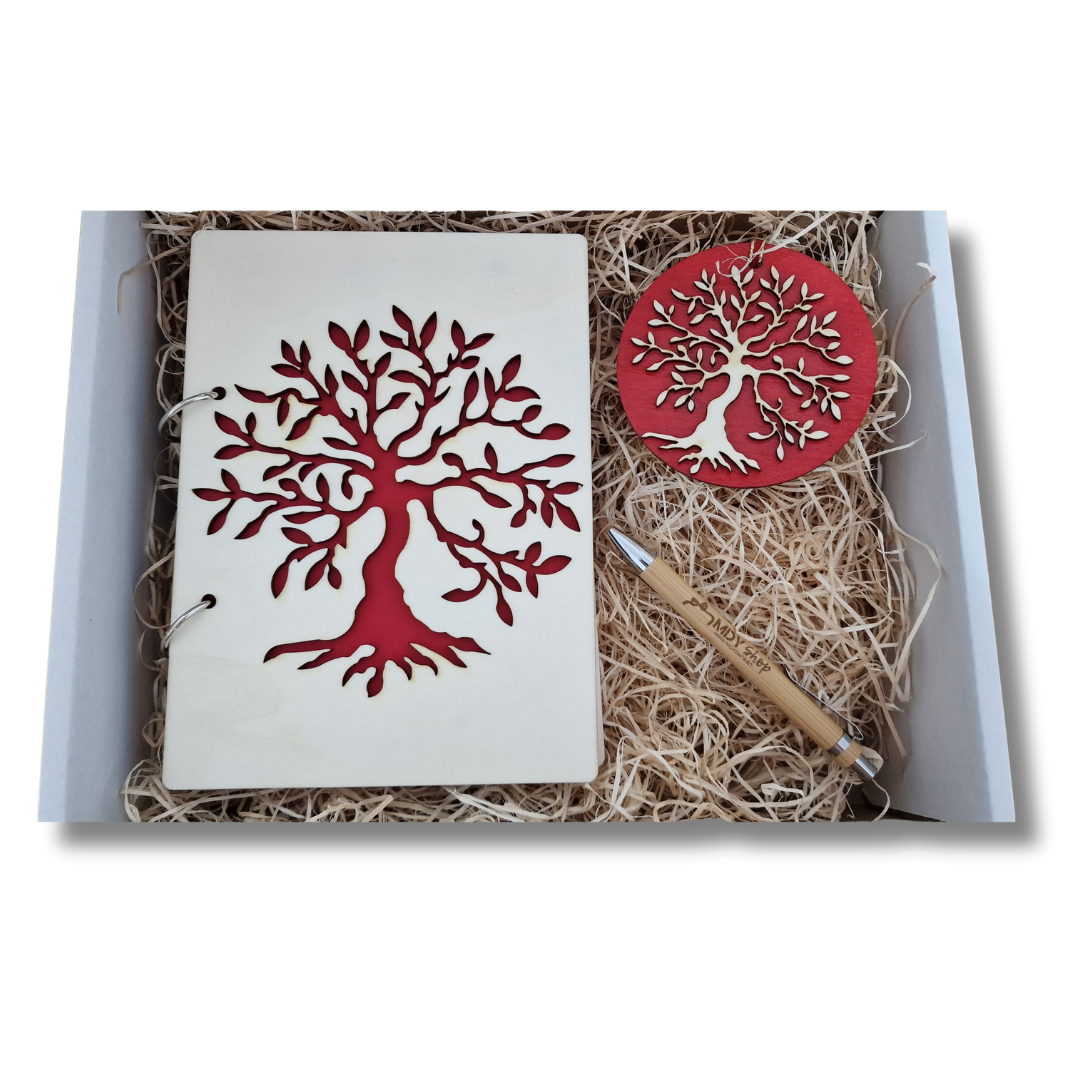 Set cadou din lemn – „Copacul vieții” (Agendă A5 reîncărcabilă, Glob de Crăciun și Pix din Bambus)