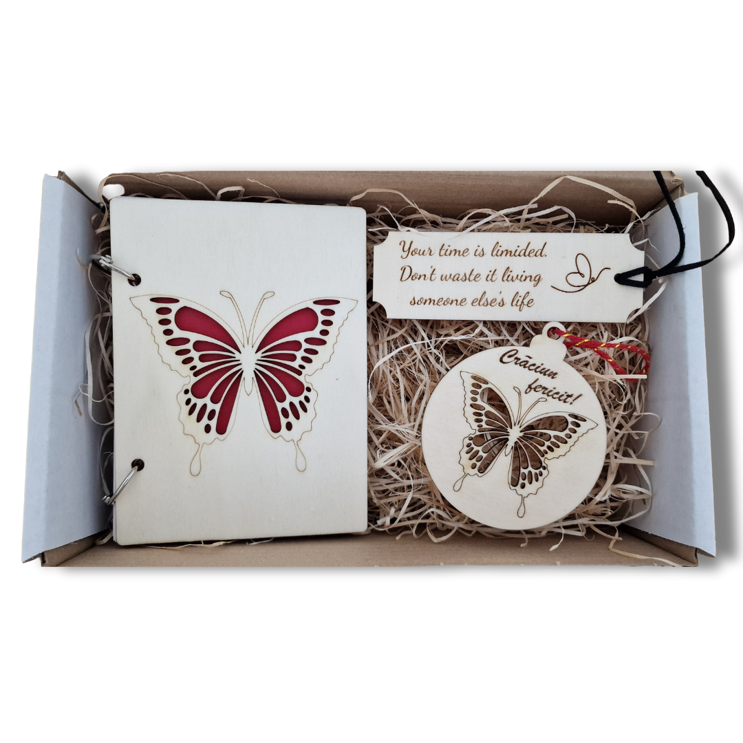 Set cadou din lemn – „Fluture” (agendă A6, glob și semn de carte)